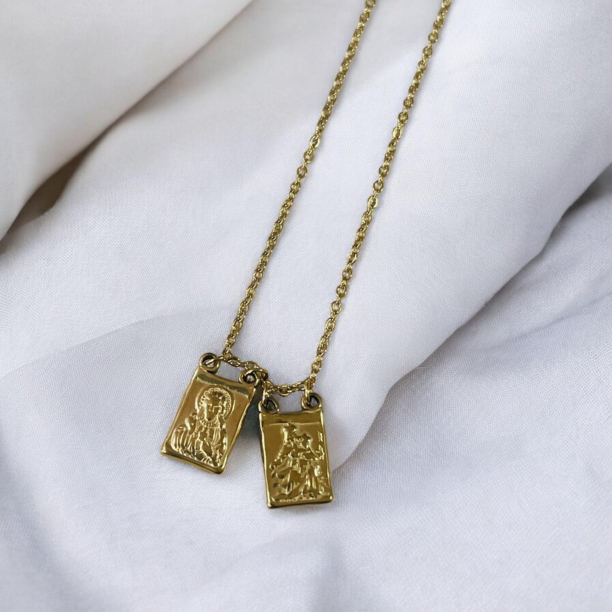 Colgante en acero con baño en oro con dos medallitas tipo escapulario. Los colgantes escapulario son tendencia y no podían faltar en Dime Ole...