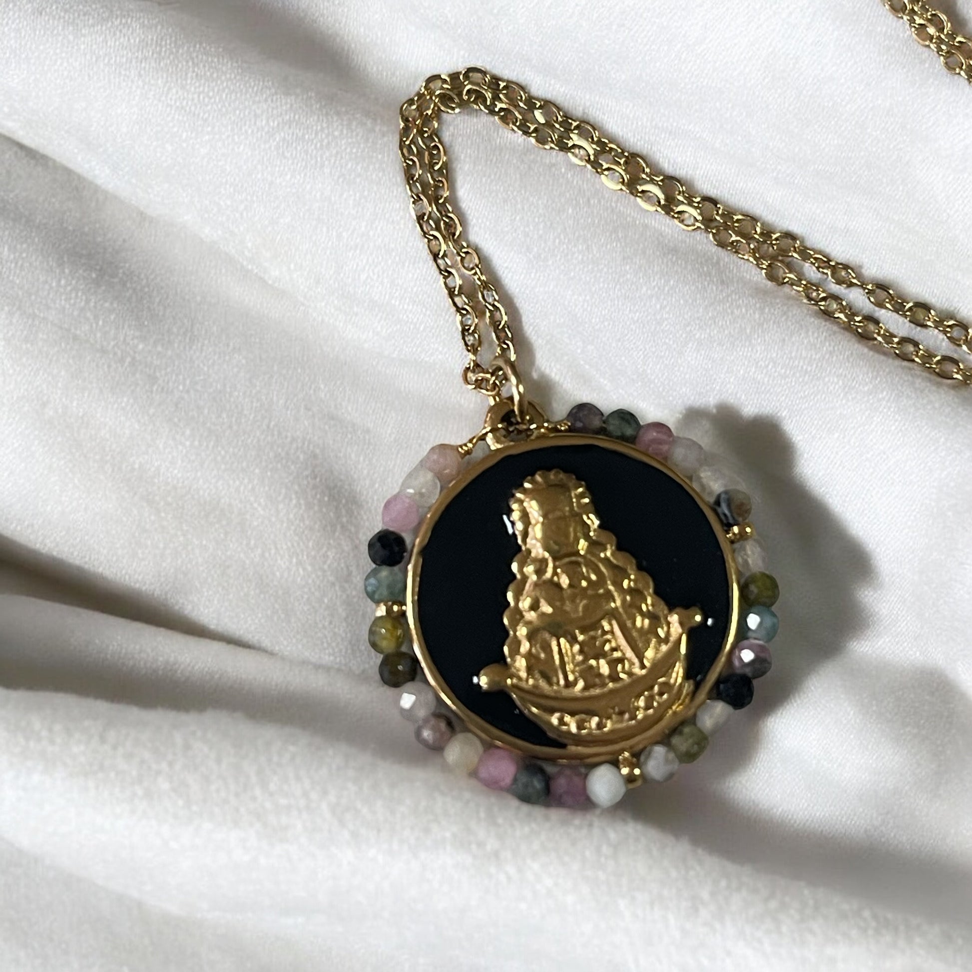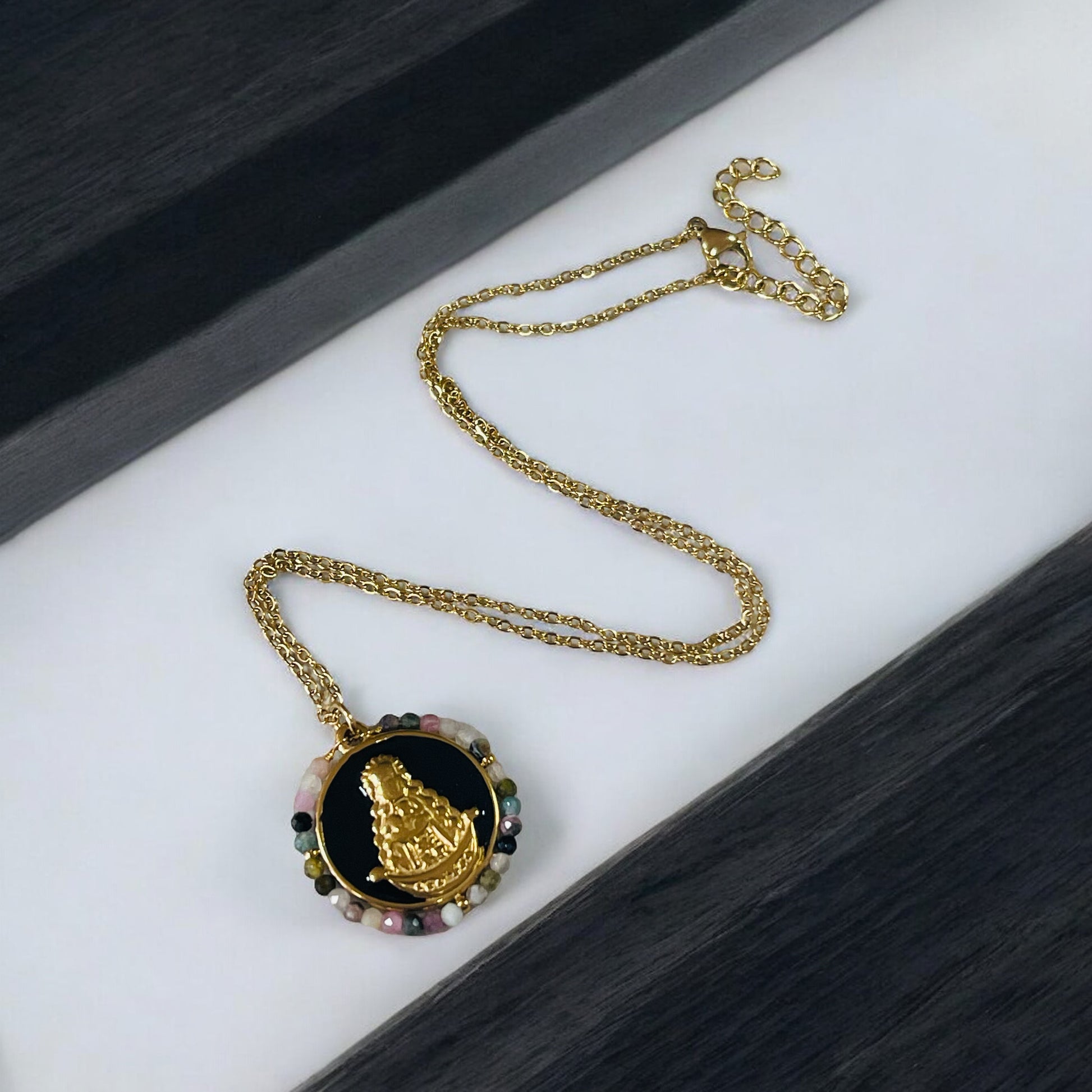 Colgante acero bañado en oro. Medalla esmaltada en color negro con detalles de piedrecitas alrededor de la medalla.