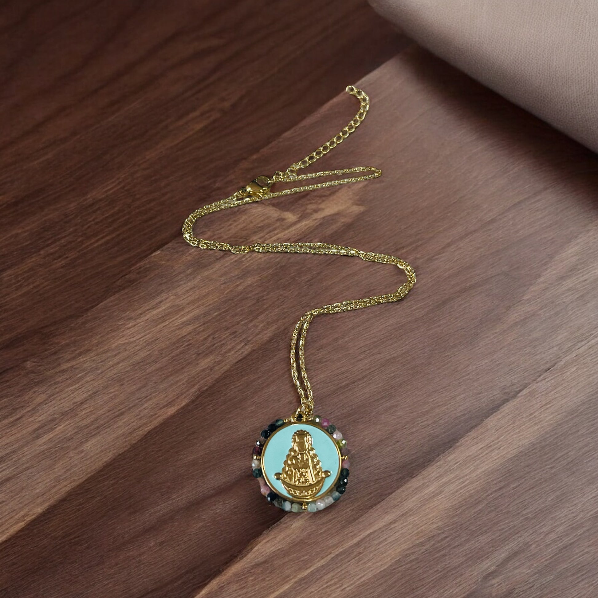 Colgante acero bañado en oro. Medalla esmaltada en color verde agua con detalles de piedrecitas alrededor de la medalla.