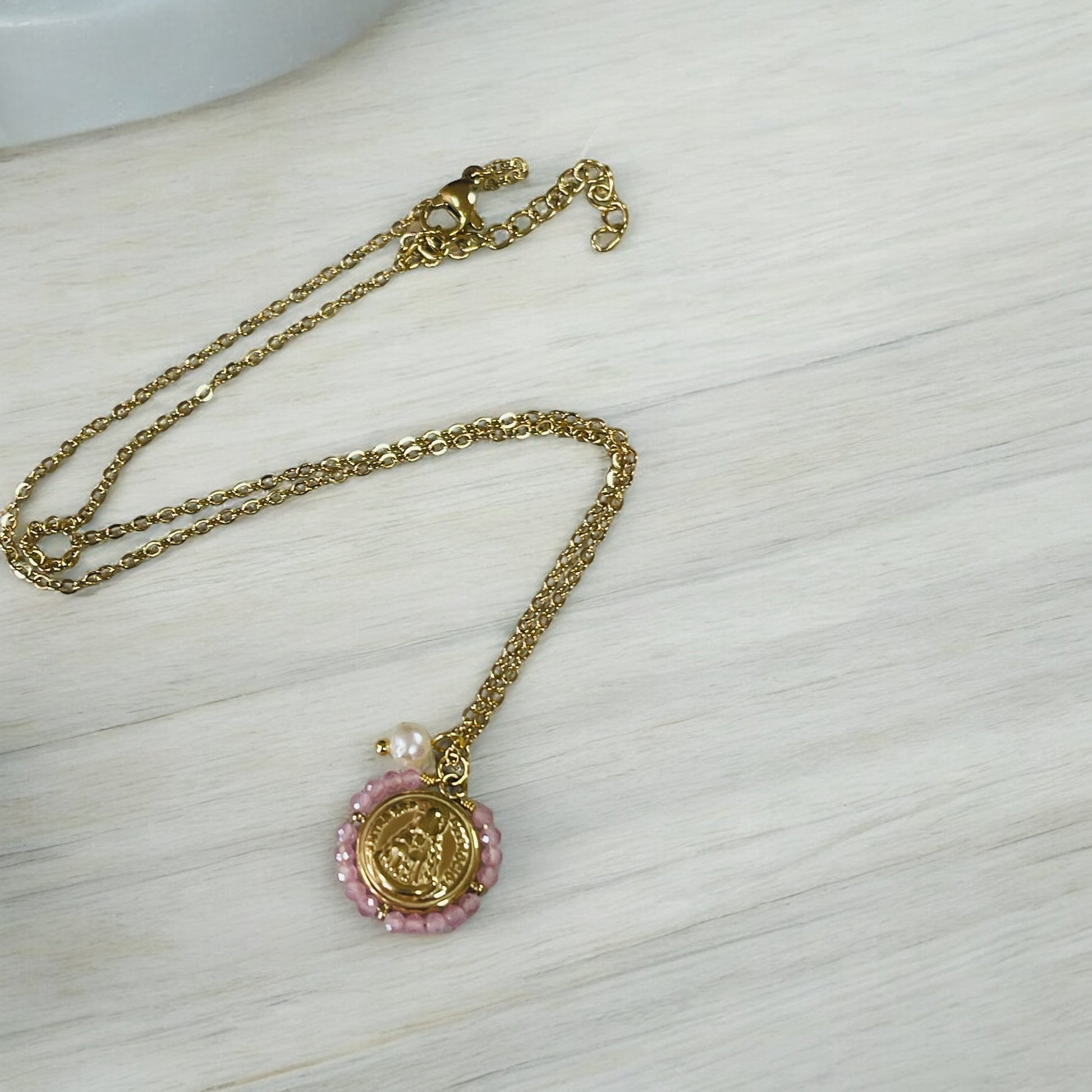 Colgante de acero con baño en oro, con detalles en rosita claro y perlita de adorno.
