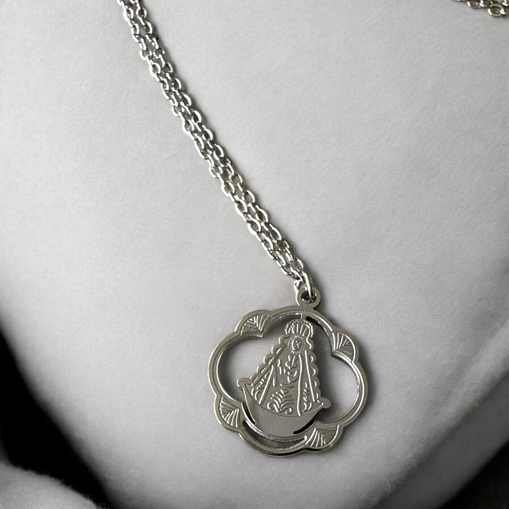 Colgante de acero con detalle de Virgen del Rocío rodeada por una orla.