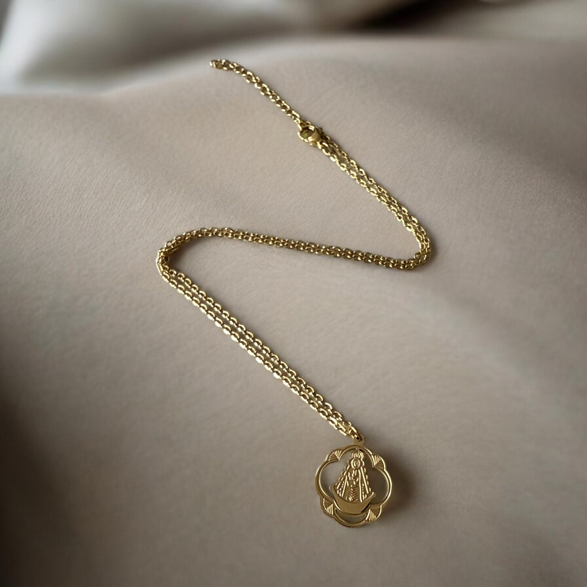 Colgante de acero dorado con detalle de Virgen del Rocío rodeada por una orla.
