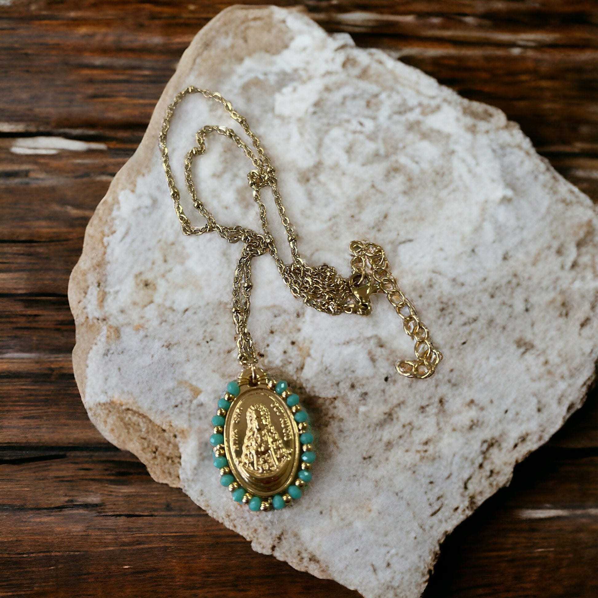 Colgante de acero con medalla de la Virgen del Rocío bañada en oro. La medalla de la Virgen está decorada con cuentas en color turquesa