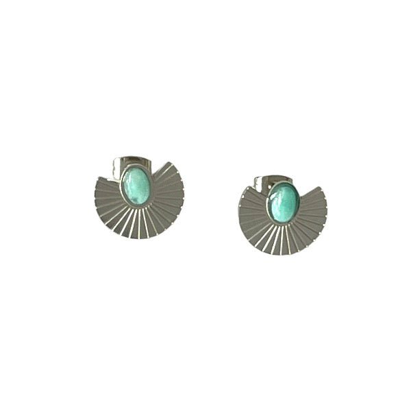 Pendiente realizado en acero con baño en plata y detalle en color verde agua.