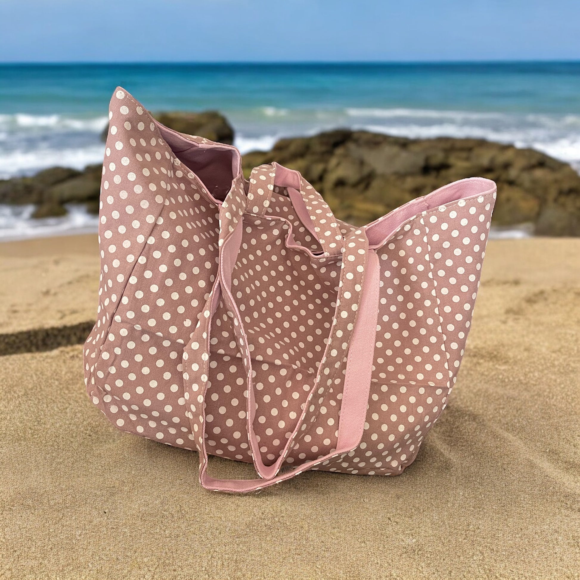 Bolsa de playa reversible. Lila por un lado y lila con lunares blancos por el otro lado.