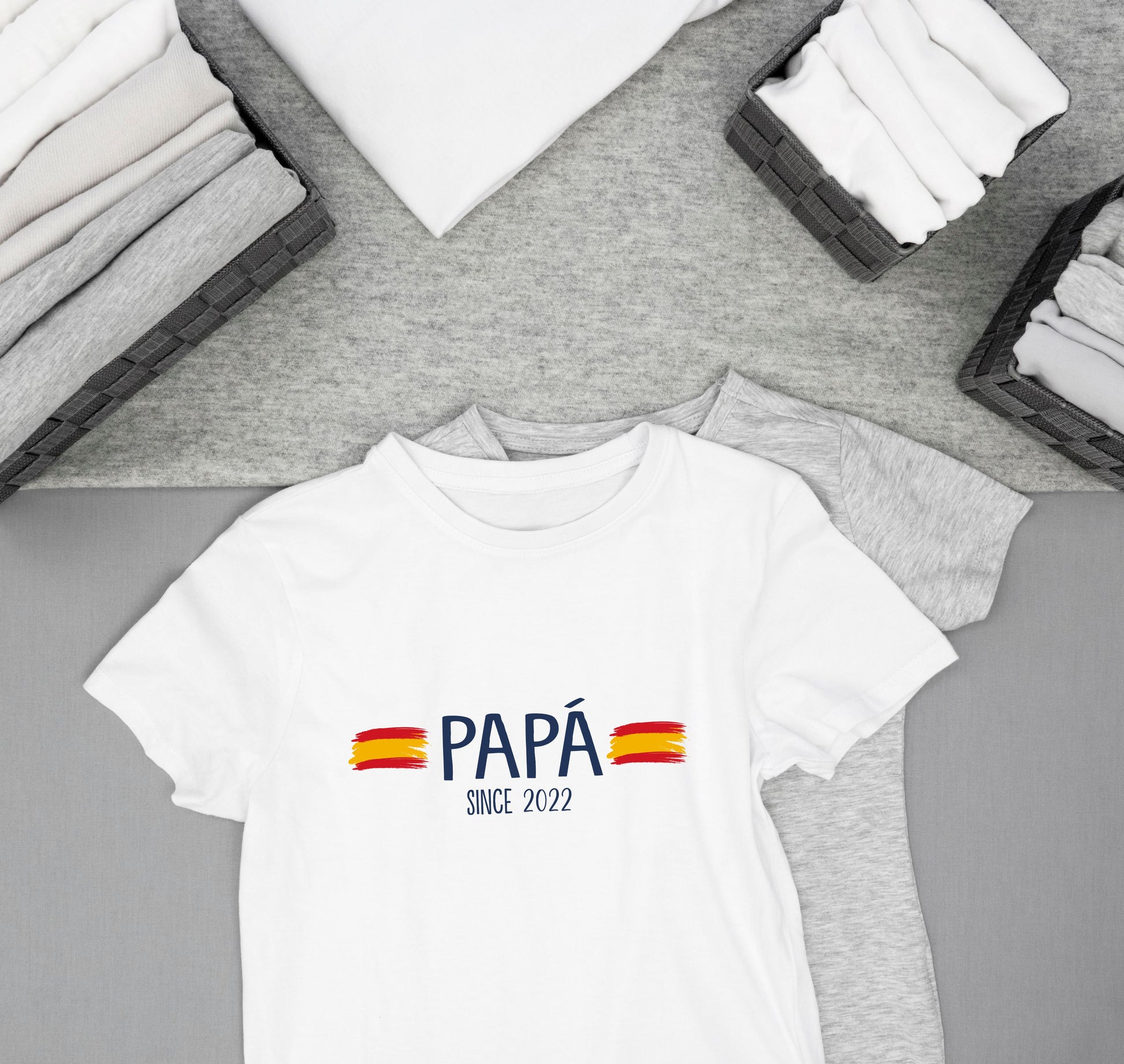 Se trata de un modelo de camiseta que puedes personalizar con la fecha y con la palabra papá (que también puedes personalizar y cambiar por abuelo, tío...). Además, lleva dos banderitas de España que le dan un toque muy nuestro.