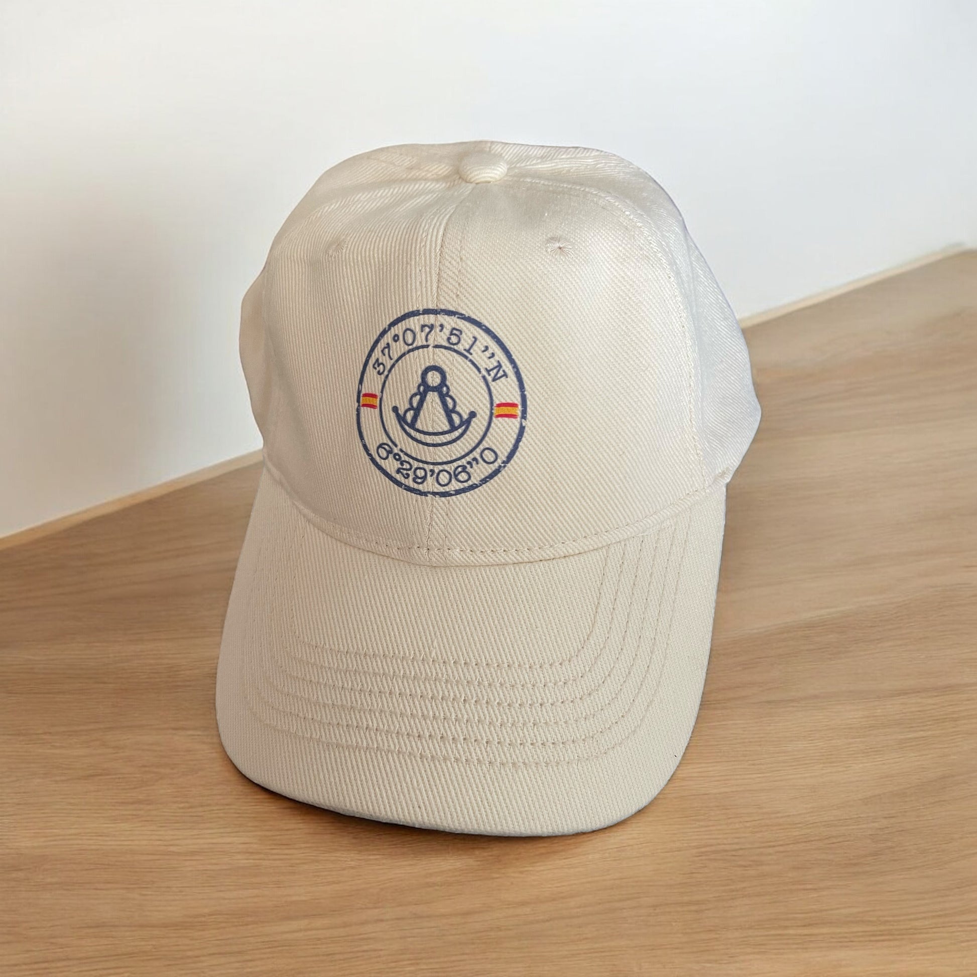 Gorra en color beige con detalle en la parte delantera de Coordenadas Virgen del Rocío.